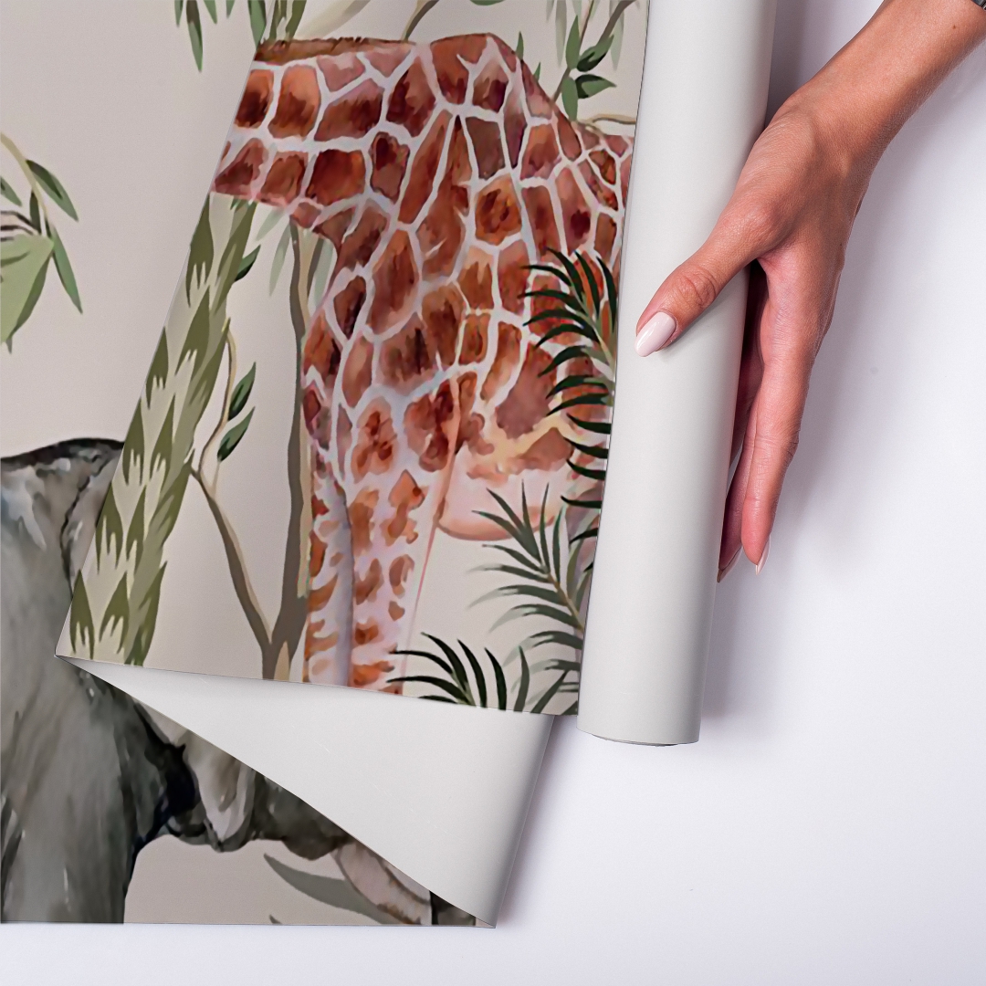 Hecho con vinilo autoadhesivo premium, el vinilo Animales de la Selva llena la pared de verdes suaves y hojas grandes que crean una atmósfera cálida, envolvente y llena de imaginación.