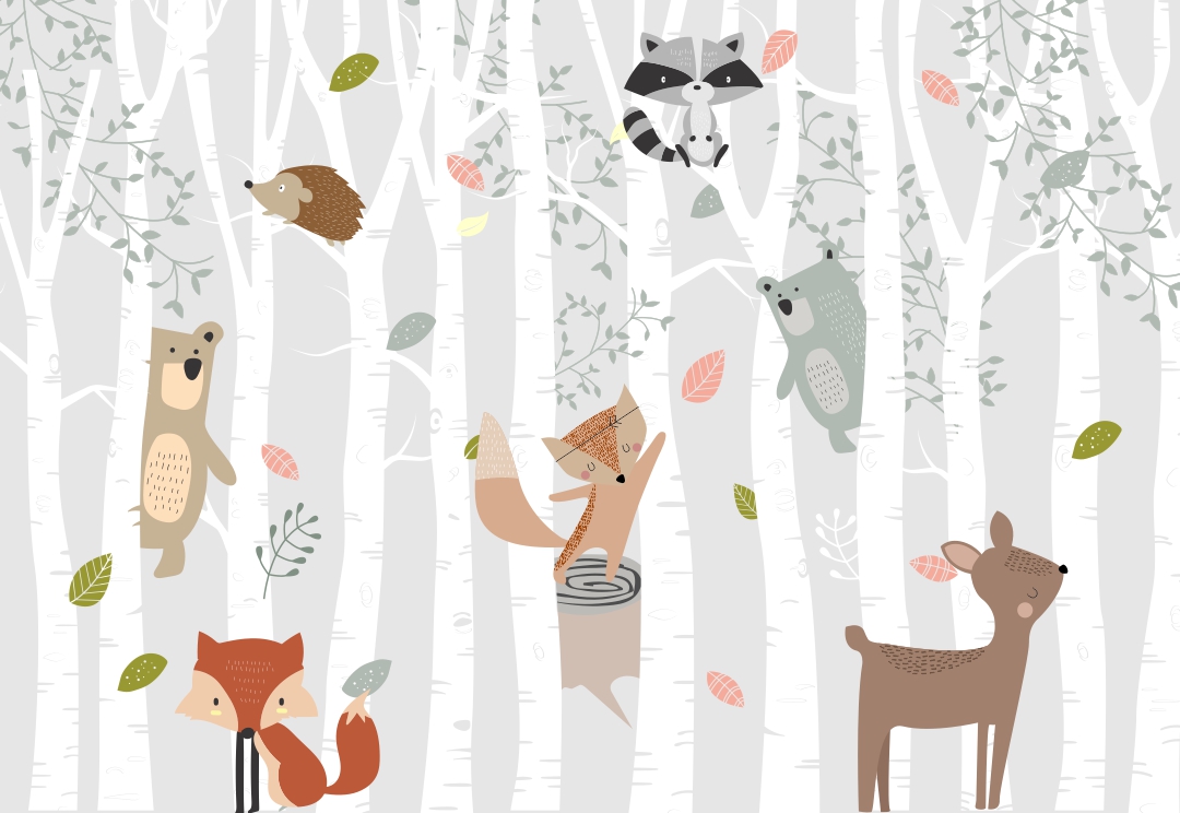 Los animales del bosque despiertan curiosidad sin saturar, las hojas generan equilibrio y la paleta calma aporta armonía a todo el ambiente.