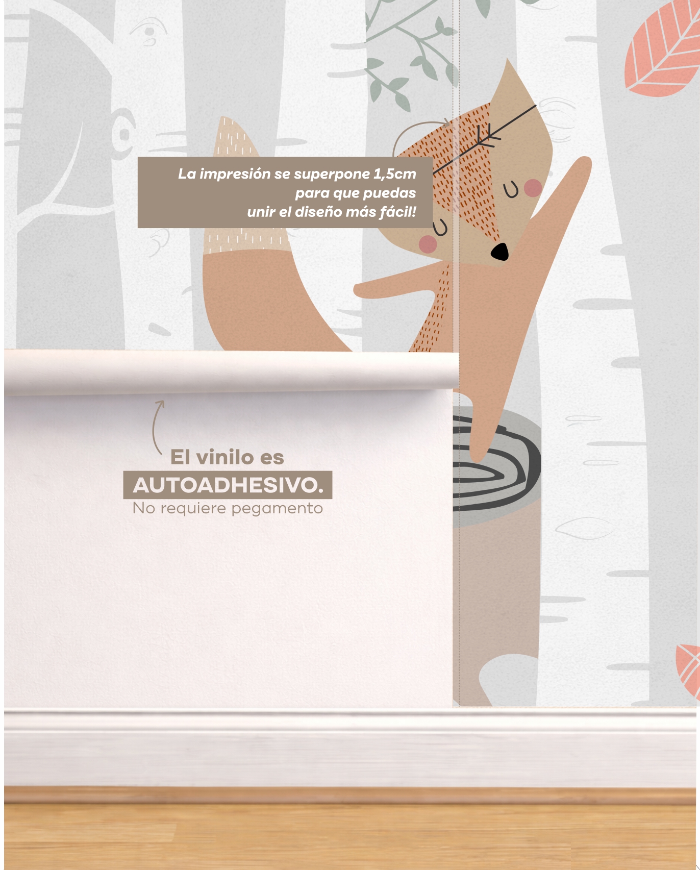 Hecho con vinilo autoadhesivo premium, el vinilo Animales del bosque llena la pared de un espacio donde él o ella puede crecer rodeado de belleza, tranquilidad y estímulos visuales suaves.