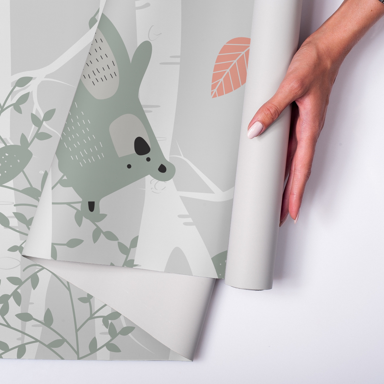 Los animales del bosque despiertan curiosidad sin saturar, las hojas generan equilibrio y la paleta calma aporta armonía a todo el ambiente.