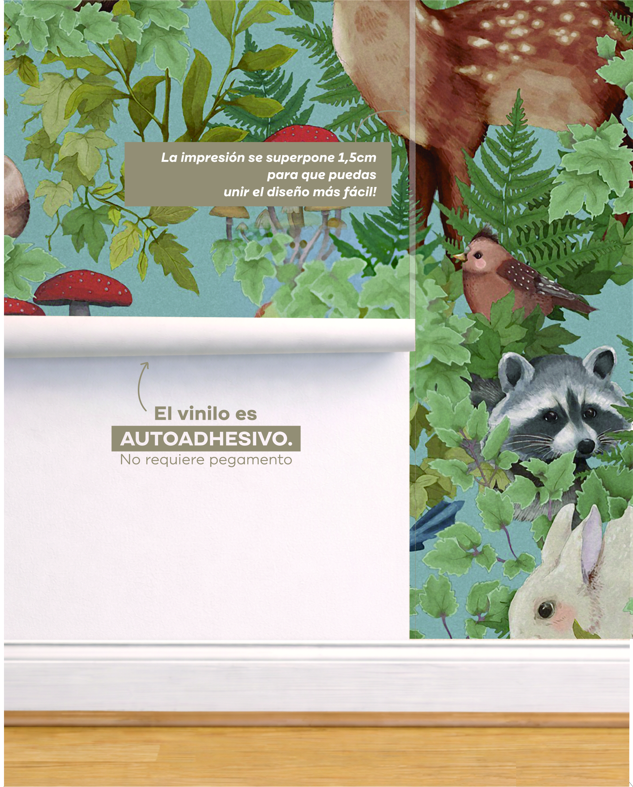 Hecho con vinilo autoadhesivo premium, el vinilo Bosque Encantado convierte la pared en un cuento vivo donde tu hijo puede sentirse protagonista.