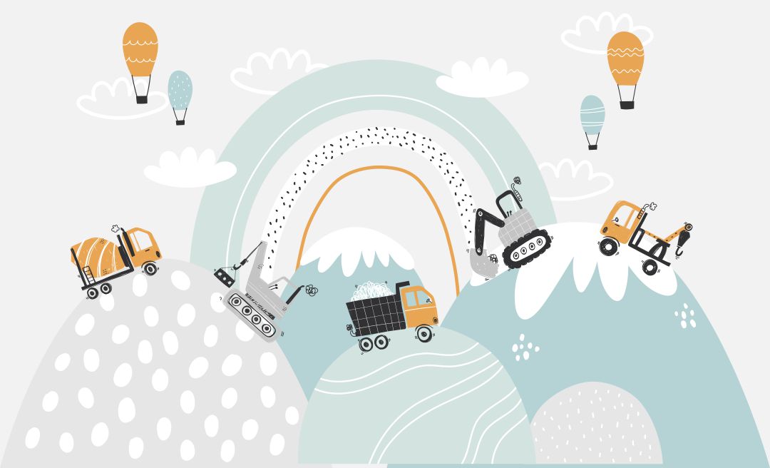 Hecho con vinilo autoadhesivo premium, el mural Camiones, montañas y arcoíris no es solo decoración...