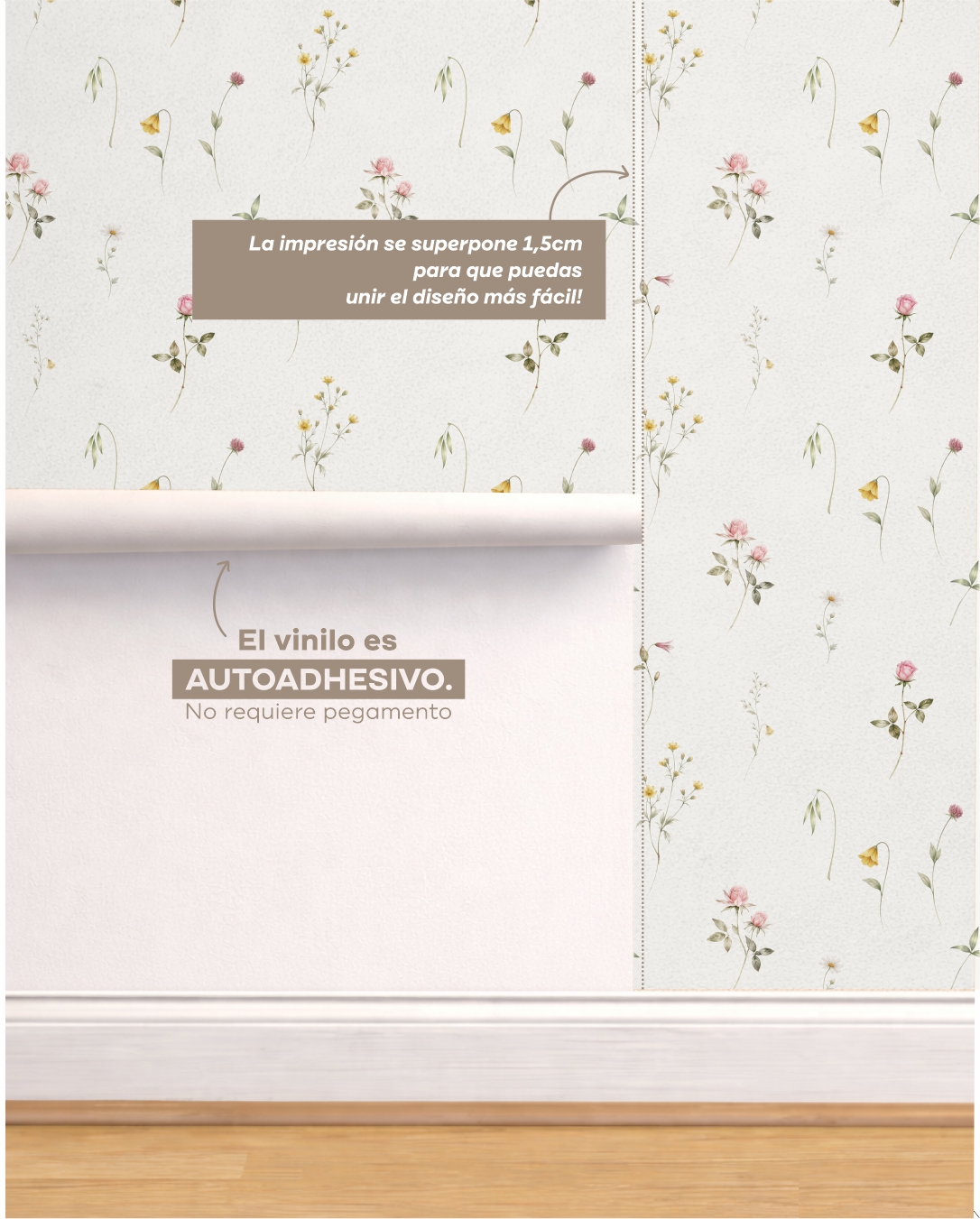 El mural Flores Pequeñas transforma la pared en un jardín delicado y sutil. Su diseño de flores dispersas, livianas y naturales crea una sensación de calma y armonía visual, como si pequeños brotes estuvieran floreciendo suavemente sobre la pared.