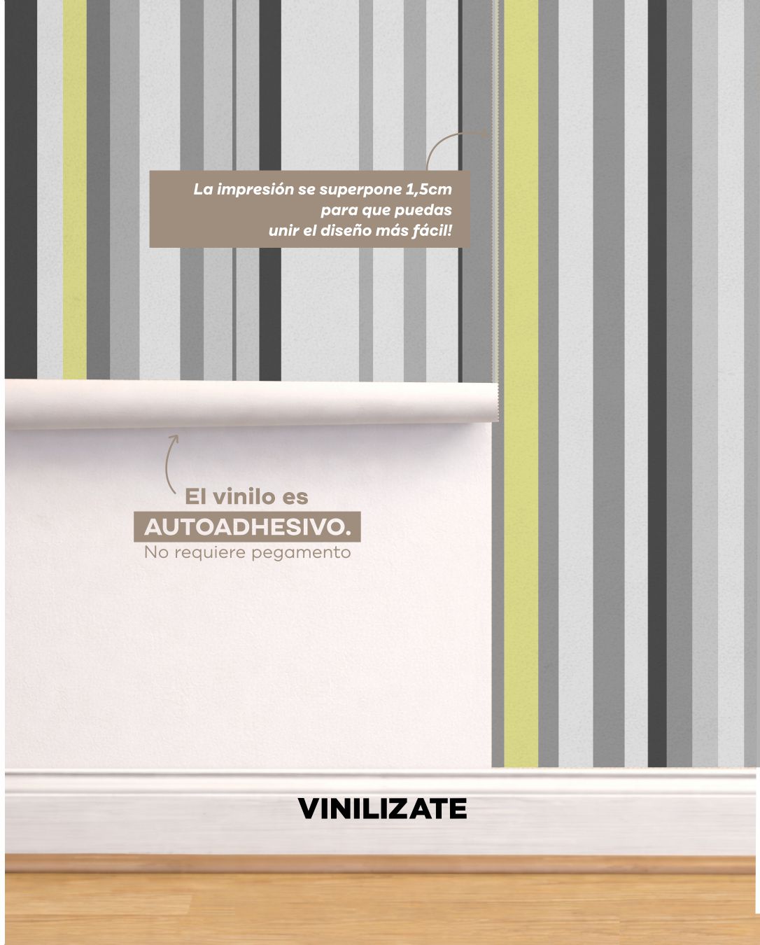 Hecho en vinilo autoadhesivo de alta calidad, se imprime a la medida de tu pared y se coloca sin obra, sin polvo y sin estrés.